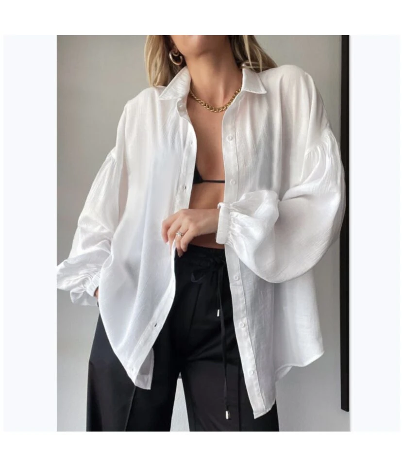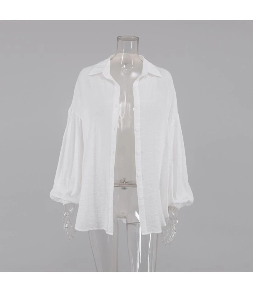 Casual Lantern Sleeve See-Through Lapel Shirt Loose Solid Color Wholesale Womens Long Sleeve T Shirts SOUN561066