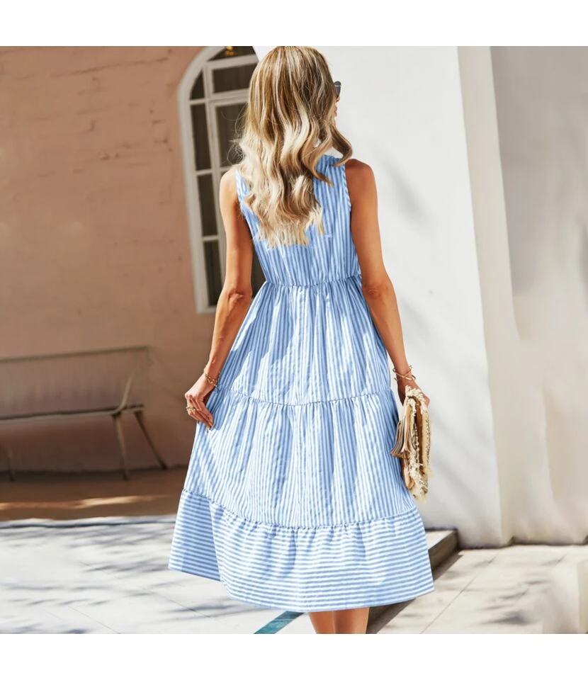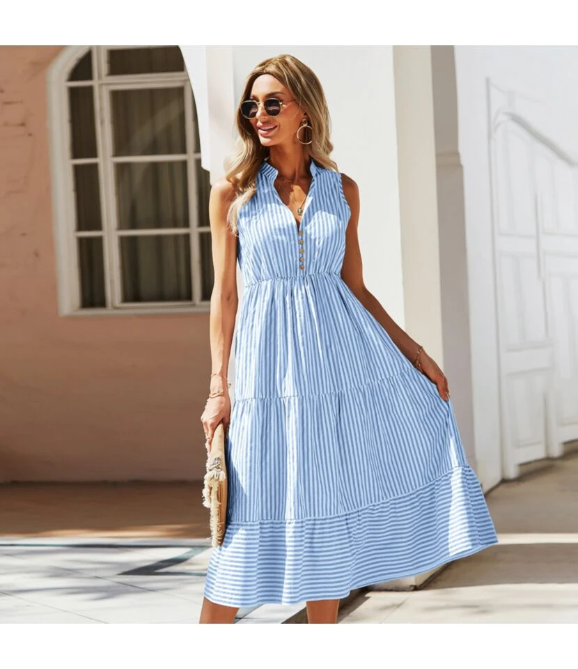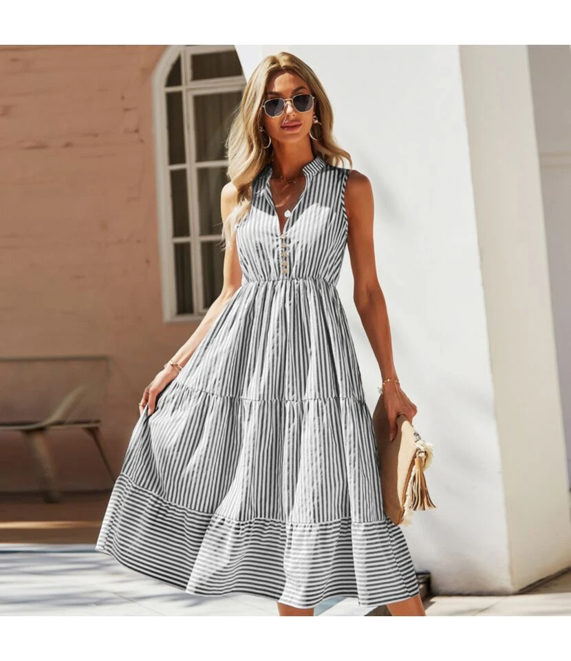 Casual Short-Sleeved Single-Breasted Solid Color V-Neck Long Dress Wholesale Dresses V5923050300060
