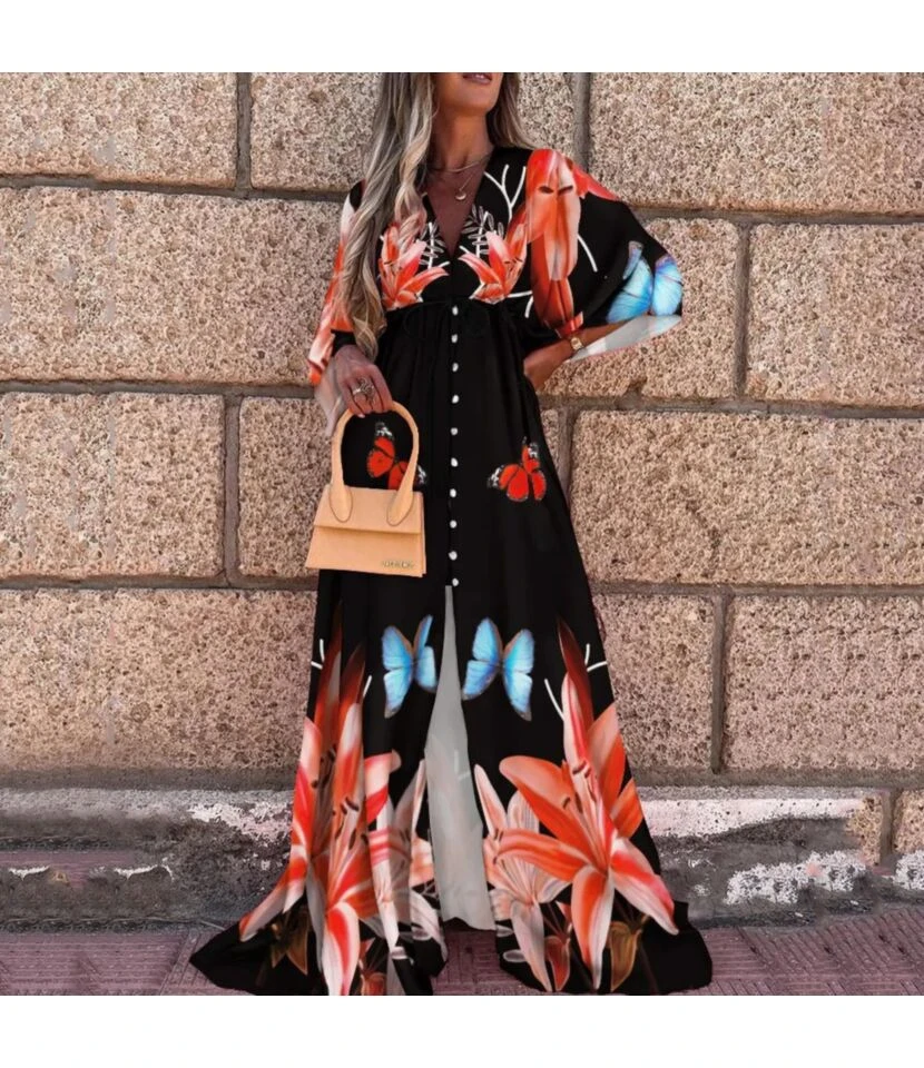 V-Neck Tie-Up Flared Sleeve Boho Slit Maxi Dress Wholesale Bohemian Dress For Women SDN536216