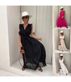 Sexy V-Neck Crossover Ruffle Sleeve Pressed Pleat Dress Wholesale Dresses N5923080800028