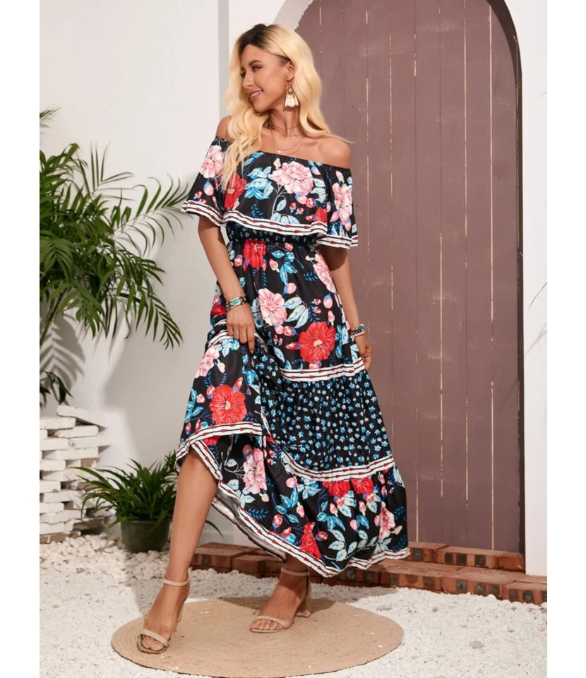 Be the first to review “Floral Print Off Shoulder Ruffled Lapel Lace-Up Waist Swing Resort Dress Wholesale Maxi Dresses SDN533386” Cancel reply