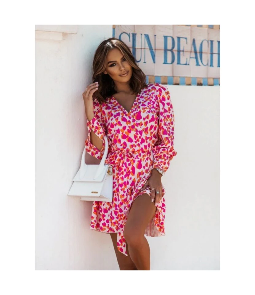 Geometric & Floral Print Womens Long Lantern Sleeve V Neck Tie-Up Waist Swing Ruffled Dress Wholesale Dresses SDN533184