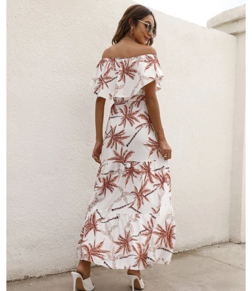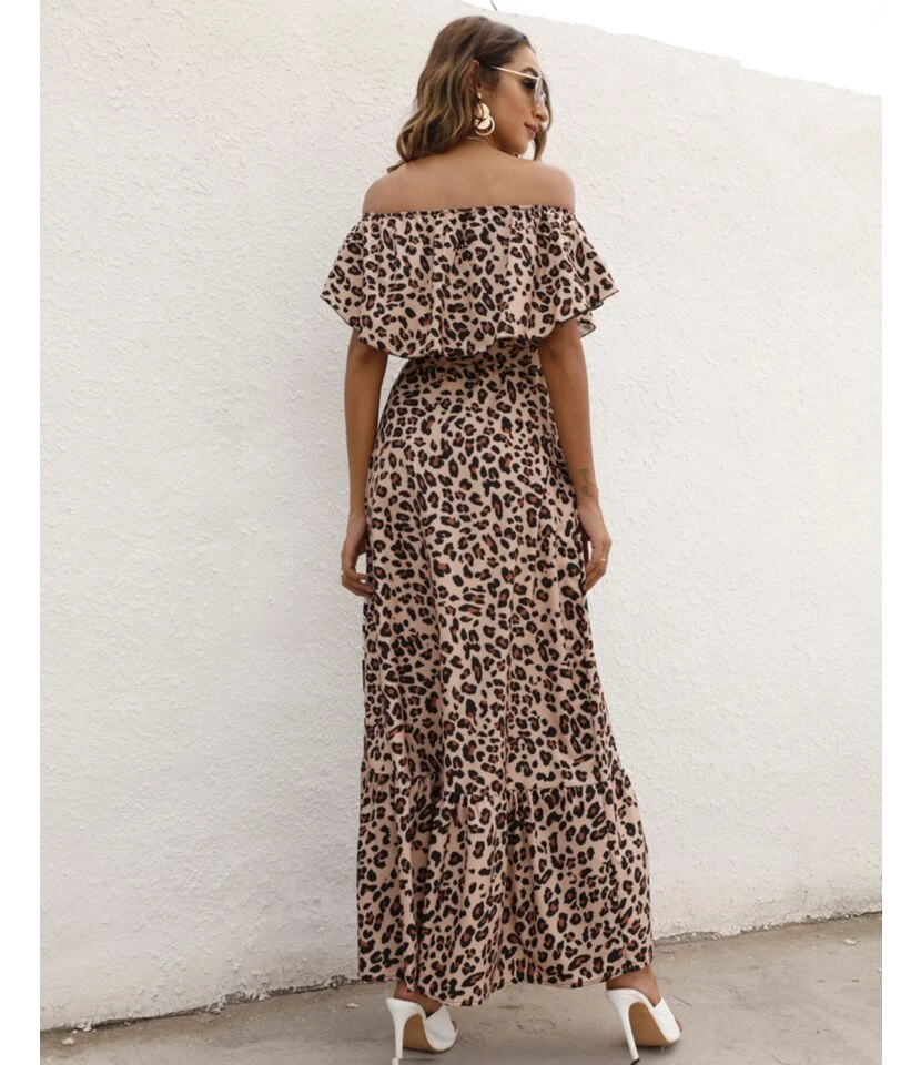 Leopard & Floral Printed Off Shoulder Ruffled Wide Lapel Resort Dress Wholesale Maxi Dresses SDN533198