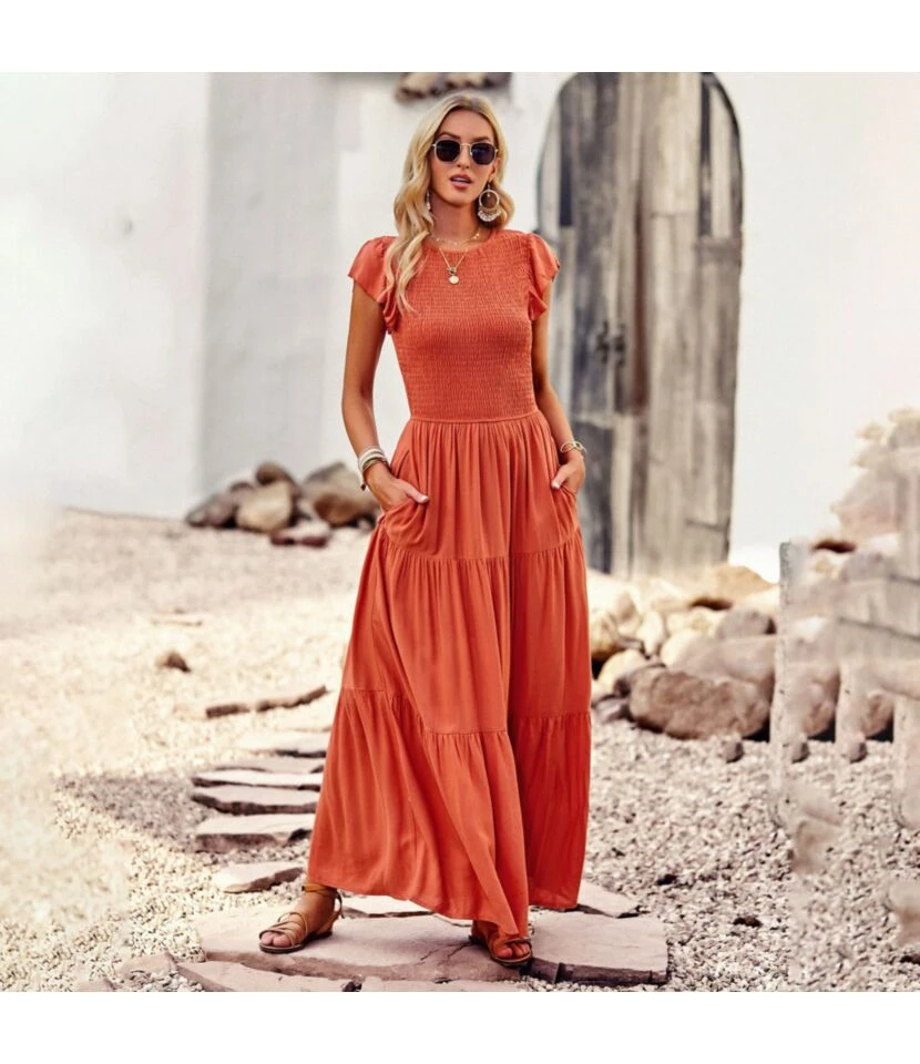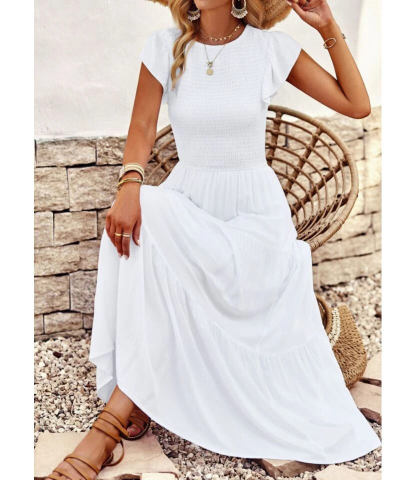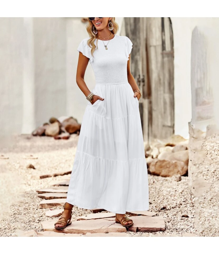 Pleated Solid Color Elegant Round Neck Dress Wholesale Dresses N4623041200018