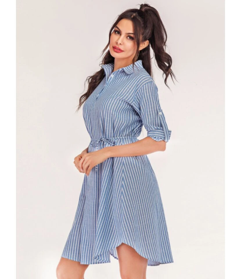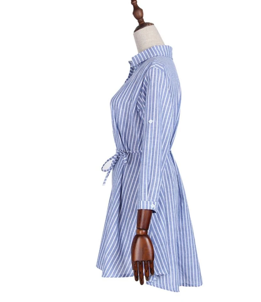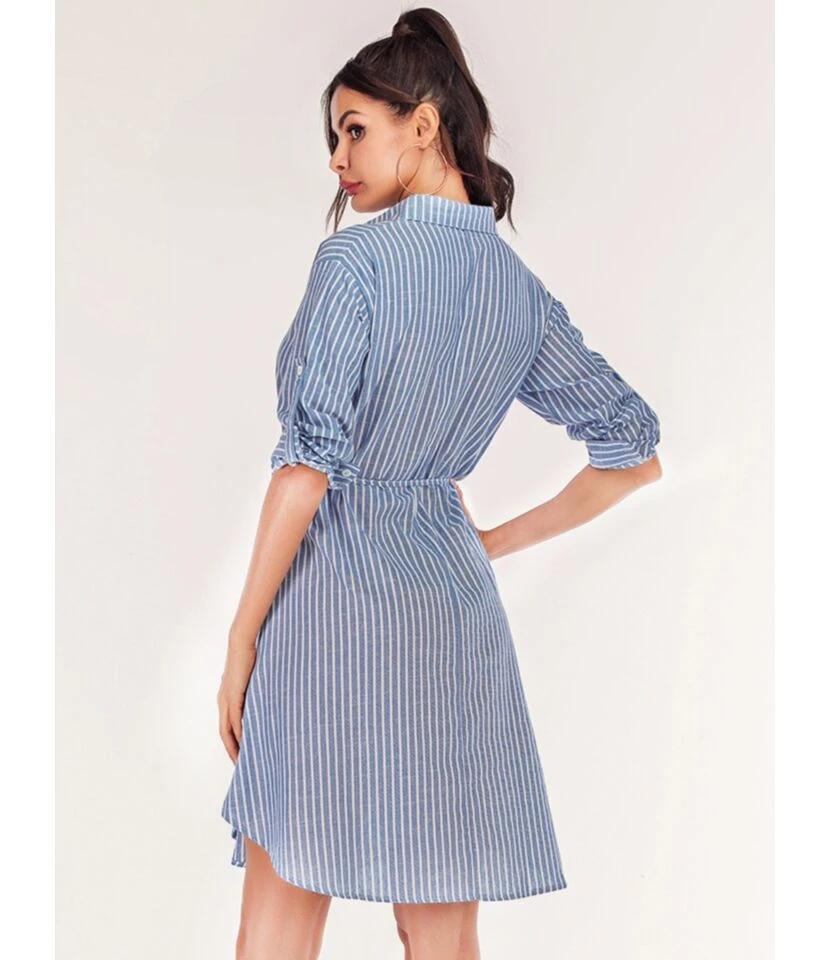 Rollable Sleeve Belted Stripe Shirt Dress