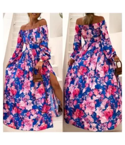 Vacation Off-Neck Floral Print Long Sleeve Slit Swing Dress Wholesale Maxi Dresses N5323031700008