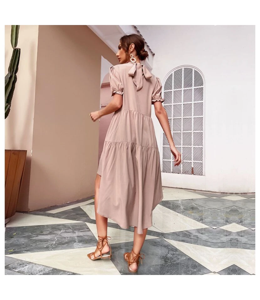 Solid Color Puff Sleeve High Neck Irregular Wholesale Pleated Dresses SD203687