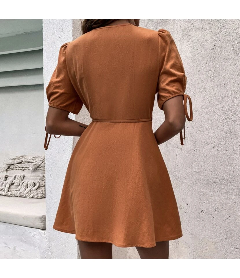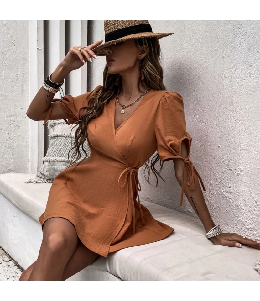 Be the first to review “Solid Color V Neck Short Sleeve Tie Waist Wholesale Mini Dresses SD204305” Cancel reply