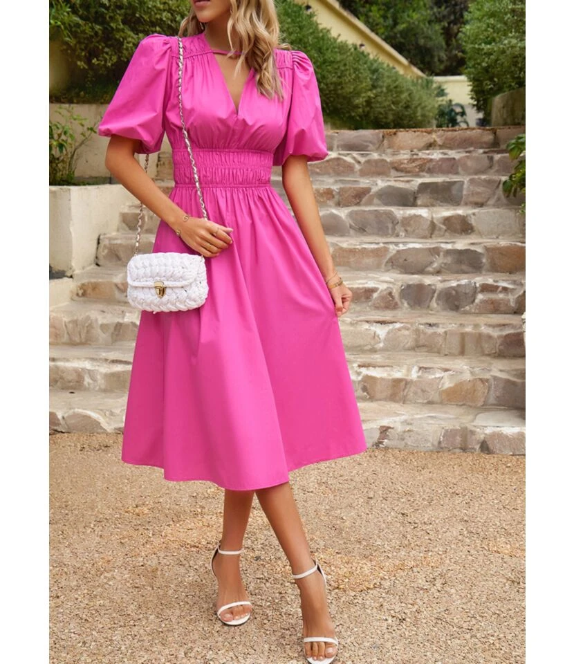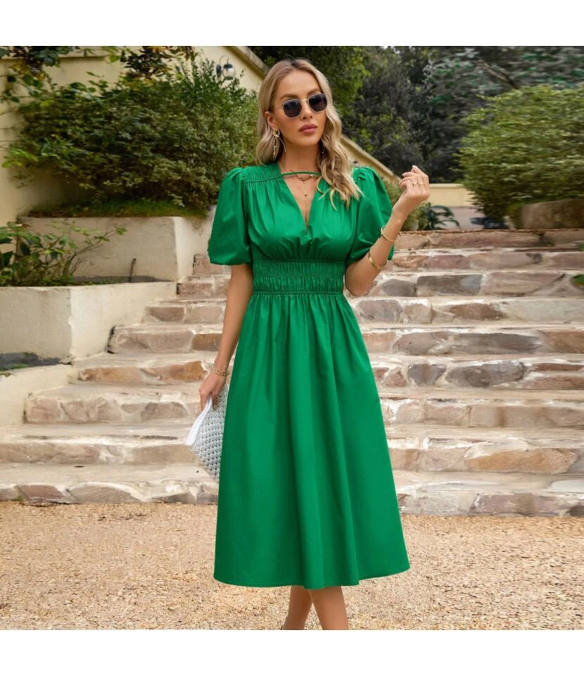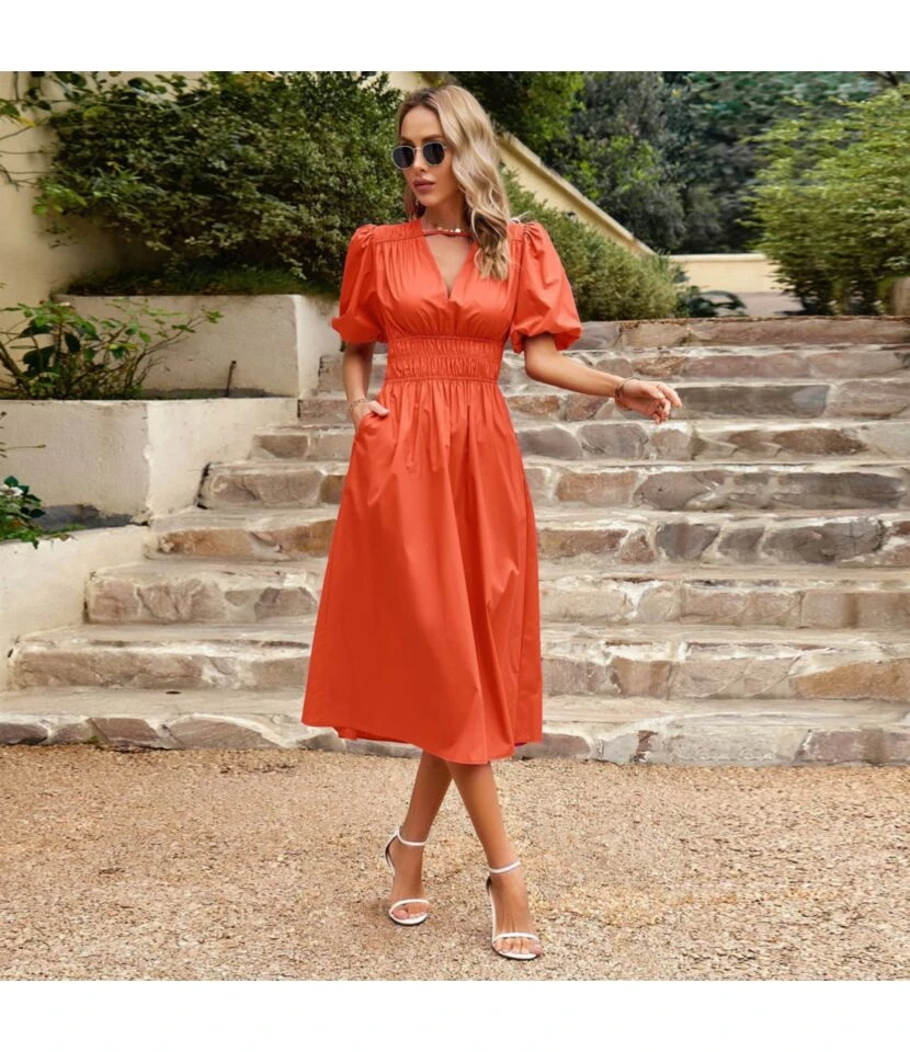 Solid Color V-Neck Waist Short-Sleeve Casual Ruffled Dress Wholesale Dresses SDN537952