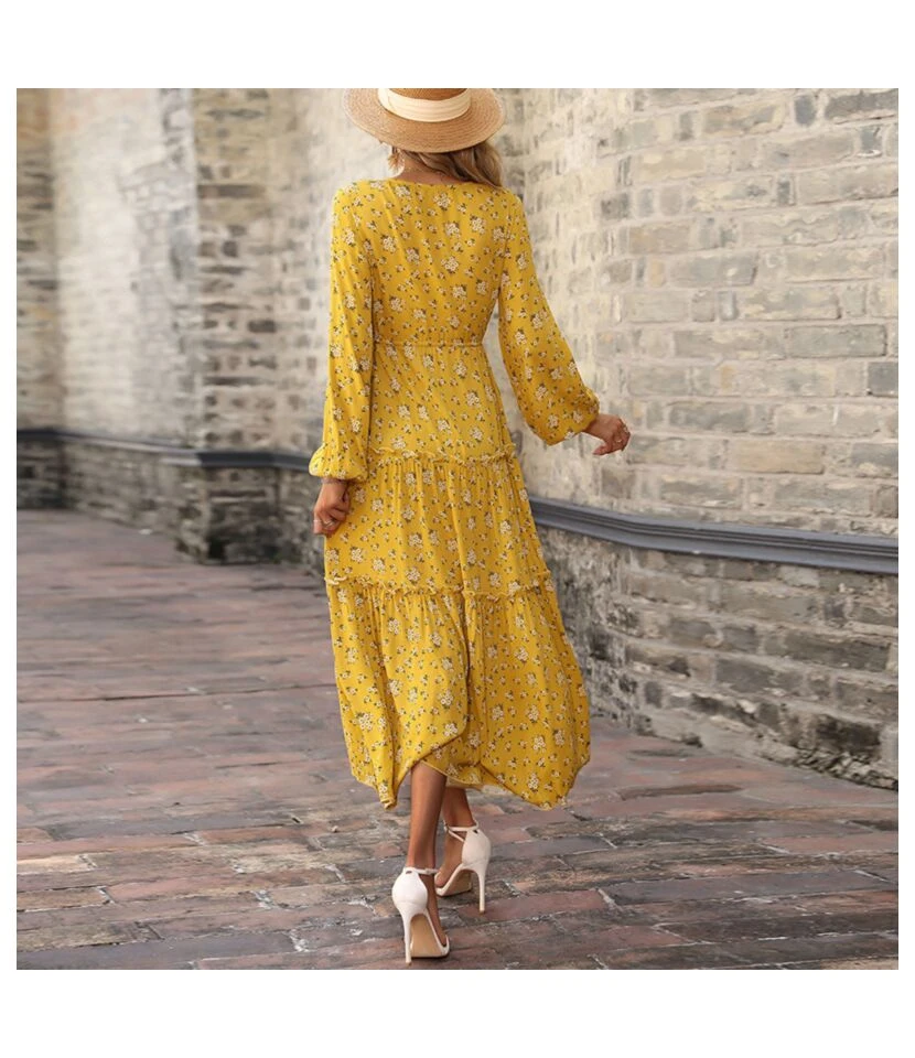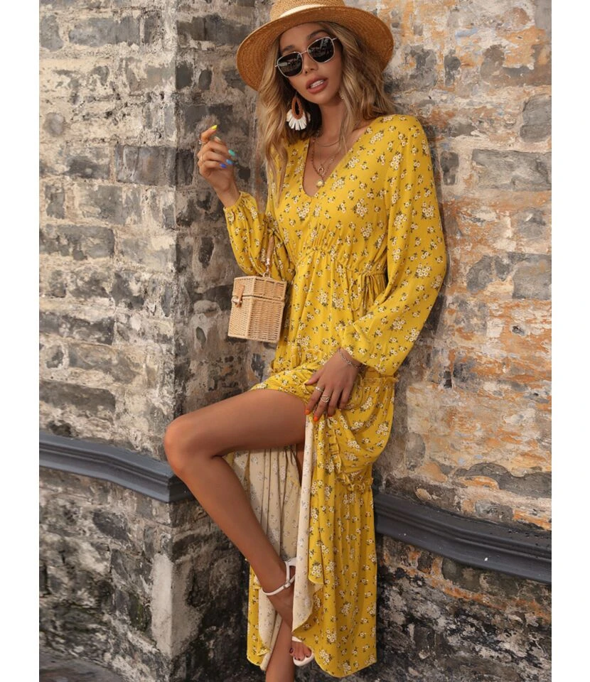V-Neck Tie-Up Flared Sleeve Boho Slit Maxi Dress Wholesale Bohemian Dress For Women SDN536216