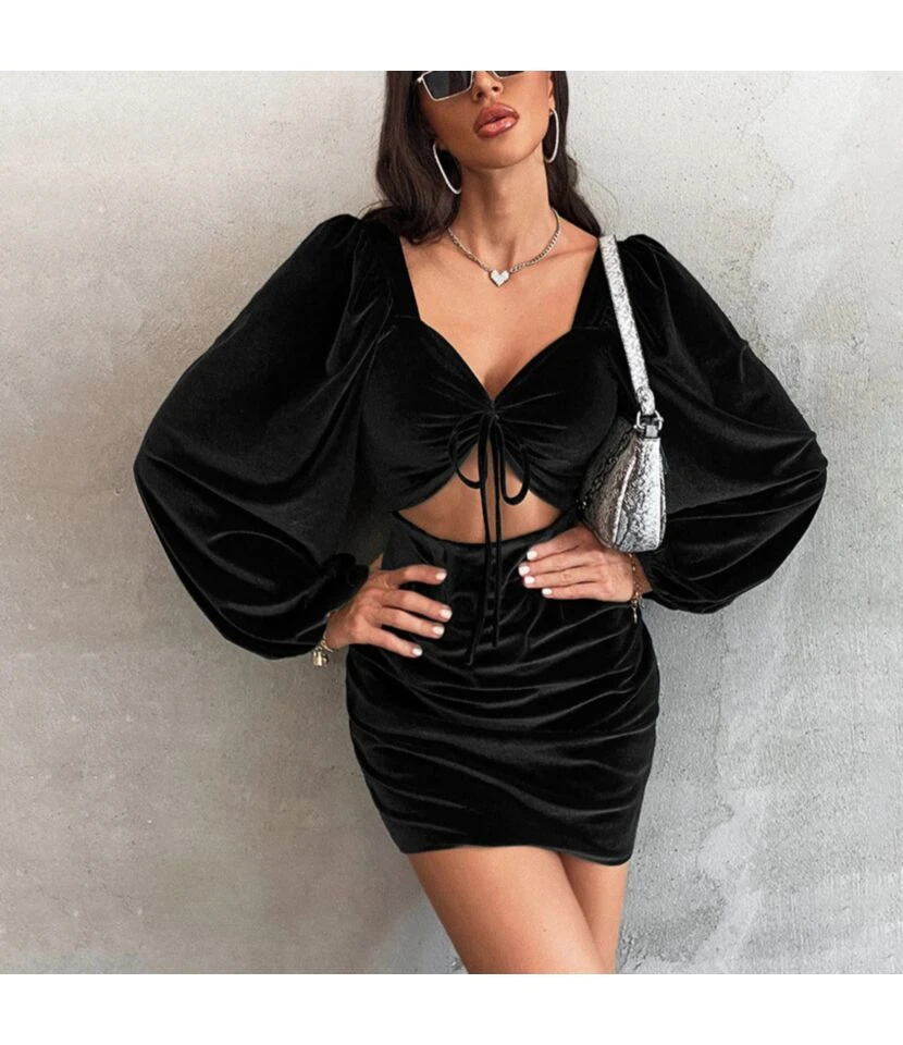 Velvet Sexy Cutout Tie-Up Dress Long Sleeve Solid Color Bodycon Wholesale Dresses SDN561545